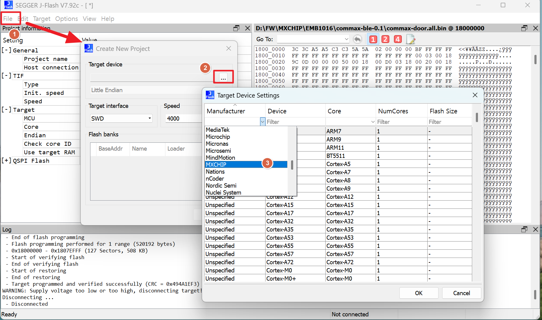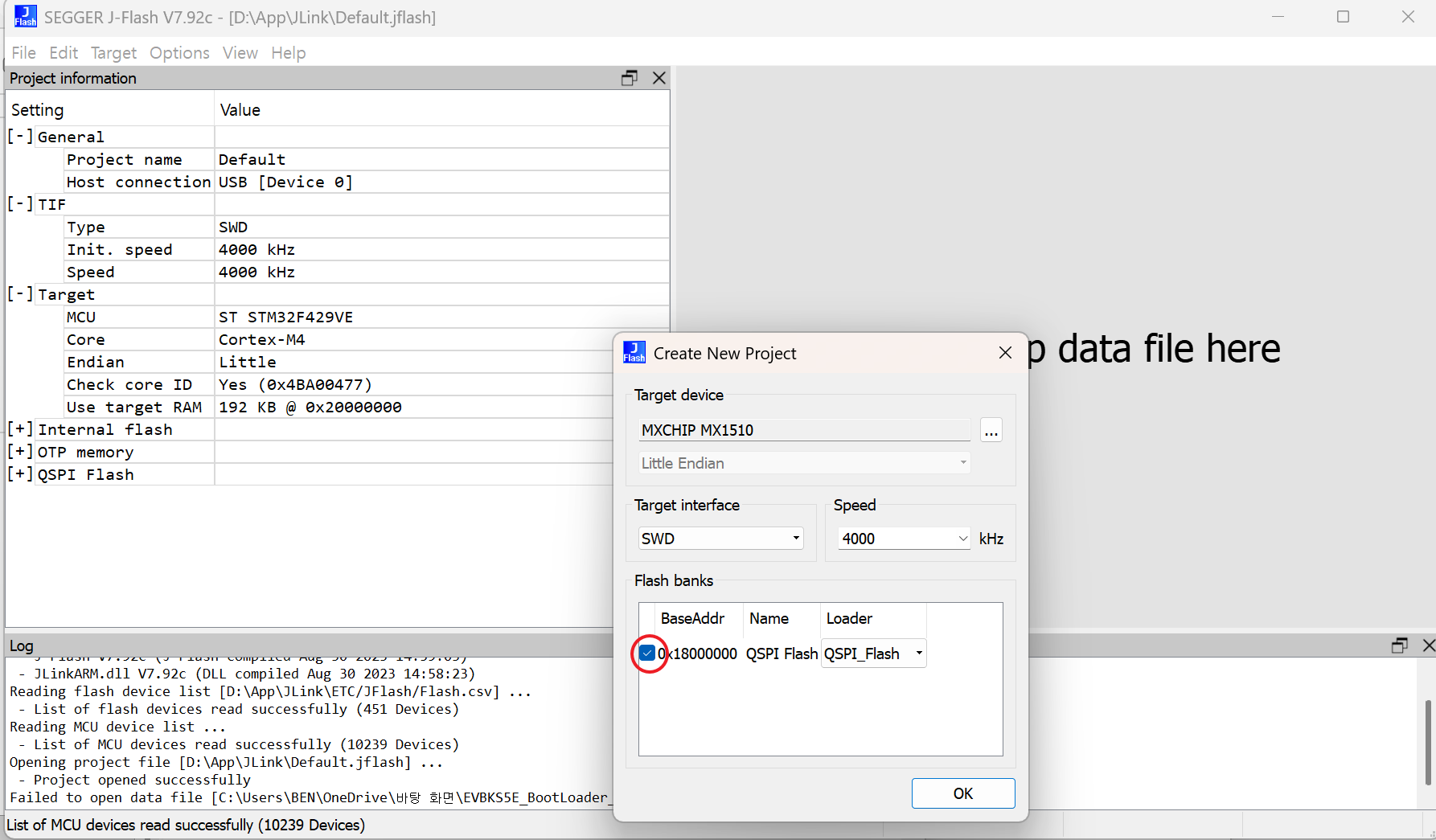 (1) Open JFlash, create a new project, and select MXCHIP → MX1510 chip
