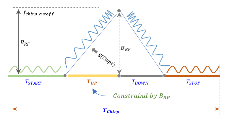Chirp timing parameters define the temporal structure of the waveform, including start, up, down, and stop periods