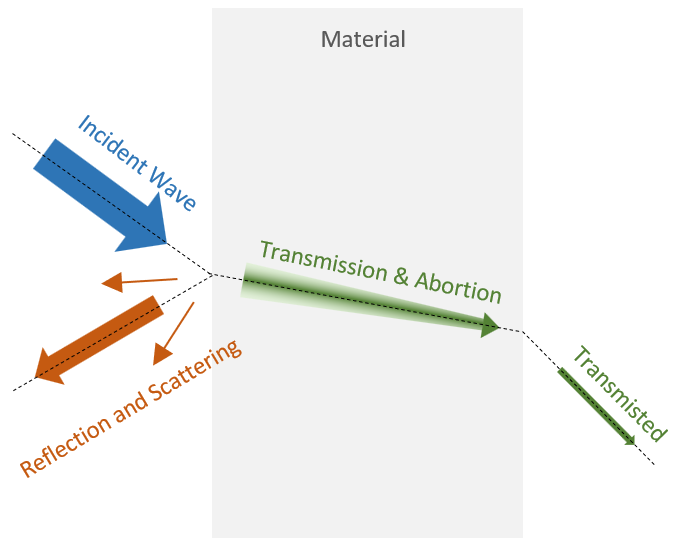 part of the energy is reflected, part is absorbed, and the rest is transmitted through the material.