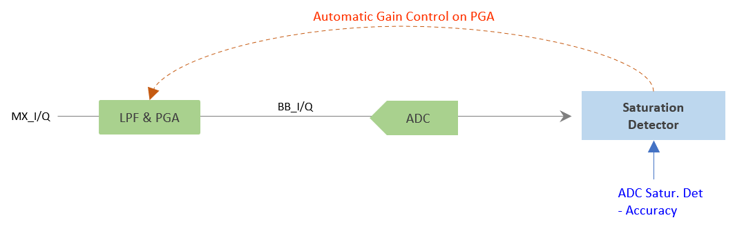 The saturation detector monitors the ADC output for clipping and dynamically adjusts the PGA gain.