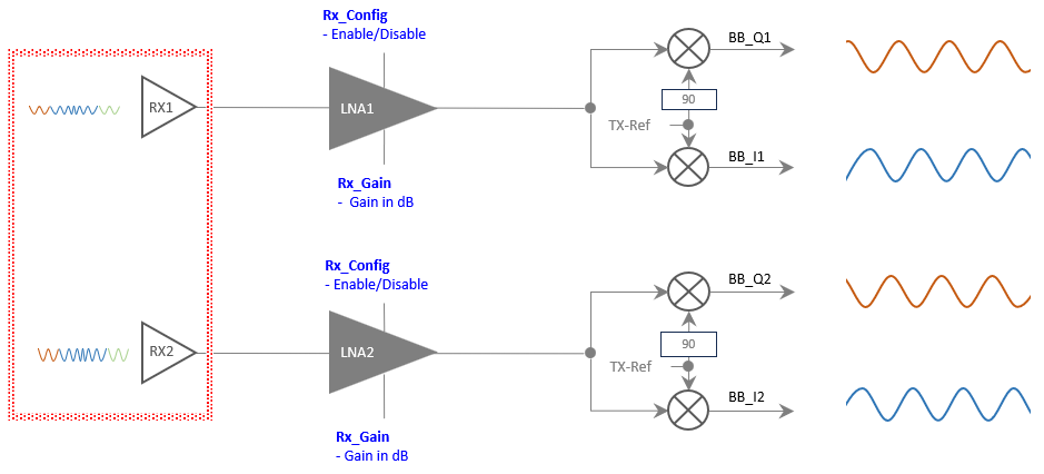 Downconverts the signal into baseband I/Q components using mixers and a reference signal(TX-Ref).